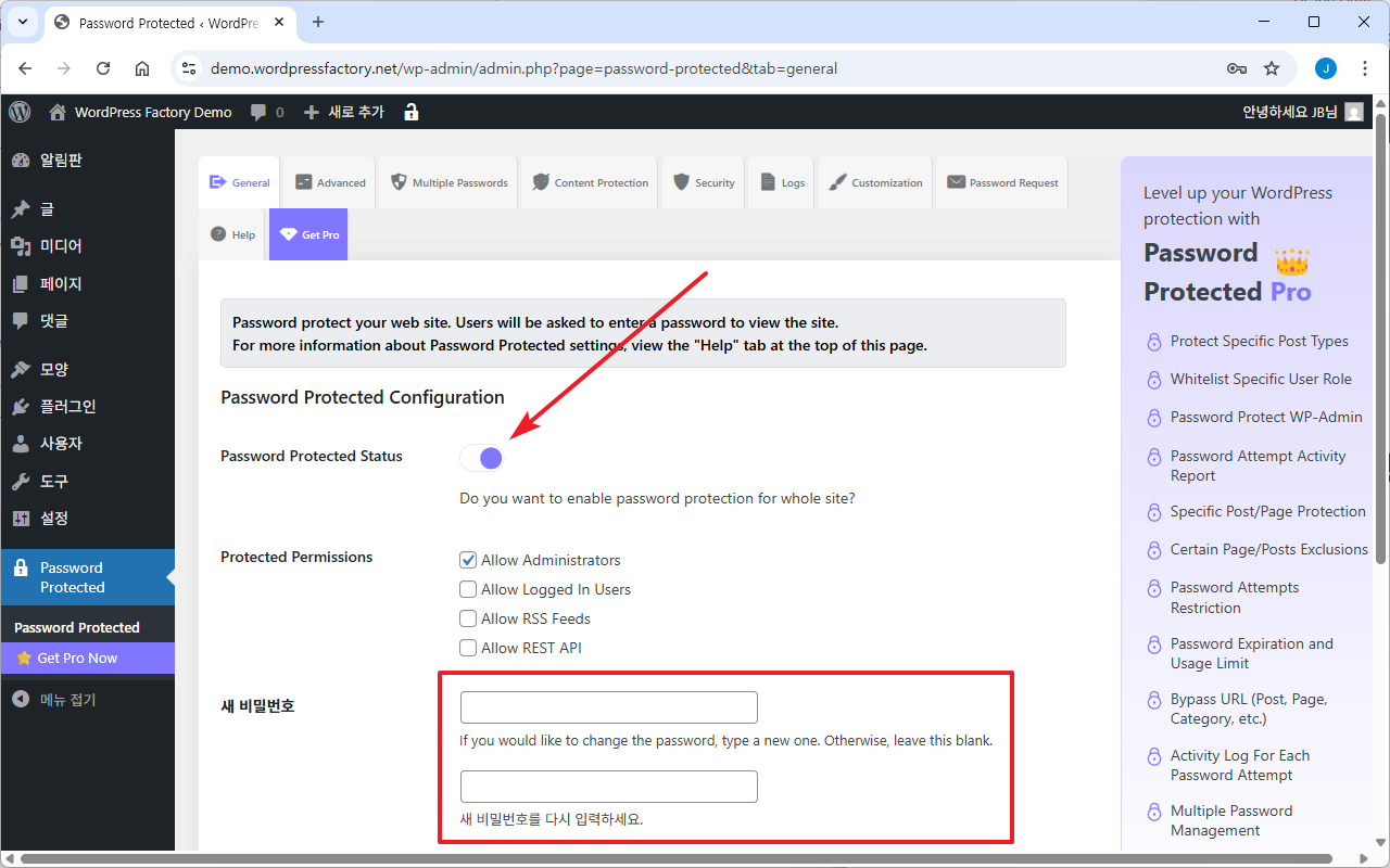비밀번호를 설정하고, Password Protected Status를 활성화하면 끝입니다.